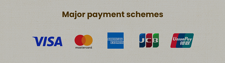 Our partners are certified by major payment schemes, including Visa International, MasterCard, JCB, China UnionPay, American Express, and Diners Club.